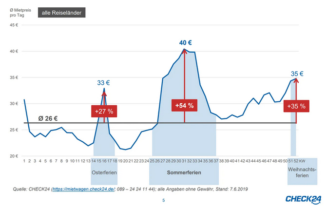 „Check24 hat erneut eine Studie über die Mietwagenpreise veröffentlicht. Hierzu wurden alle bereits getätigten Mietwagenbuchungen mit Abholdatum in 2019 ausgewertet. (…) Das Ergebnis verwundert nicht wirklich. Urlaub in den Ferien ist prinzipiell teurer als im restlichen Jahr. Die durchschnittlichen Preise für Leihwagen sind in den gebuchten Urlaubsländern in den Sommerferien 2019 um bis zu 54 Prozent höher als vergleichbare, durchschnittliche Tagespreise im Rest des Jahres. Ausgewertet wurden hierfür alle Buchungen für 2019.