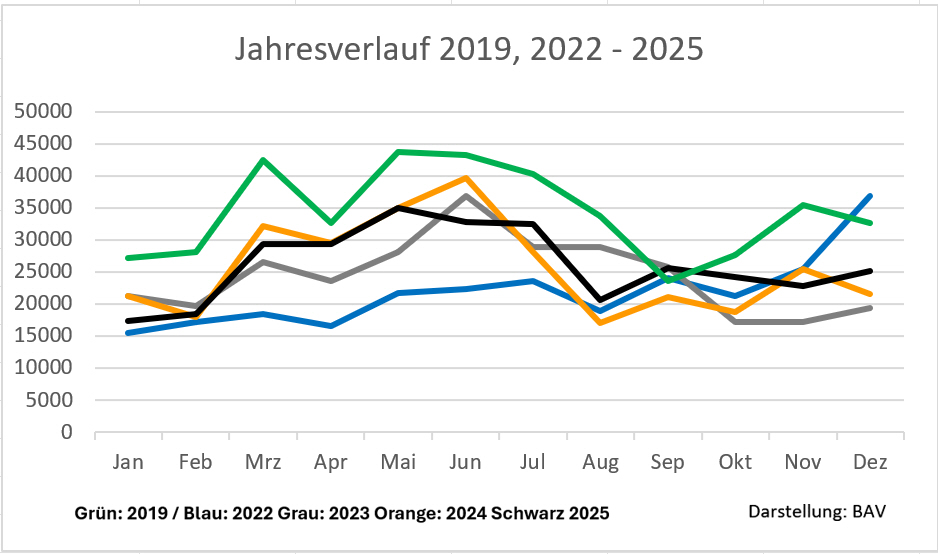 Wie im ersten Halbjahr letzten Jahres stiegen sie für eine gewisse Zeit wieder merklich, um dann doch abzufallen. Seit diesem Einbruch nach 2019 sind die Zahlen im ersten Halbjahr jeweils erheblich höher als um zweiten Halbjahr.
