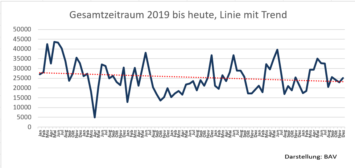 Trendlinie über fünf Jahre, seit 2019, mit Corona erstmalig mit sinkender Tendenz, dann anhaltend auf niedrigerem Niveau und nun wieder steigend.
