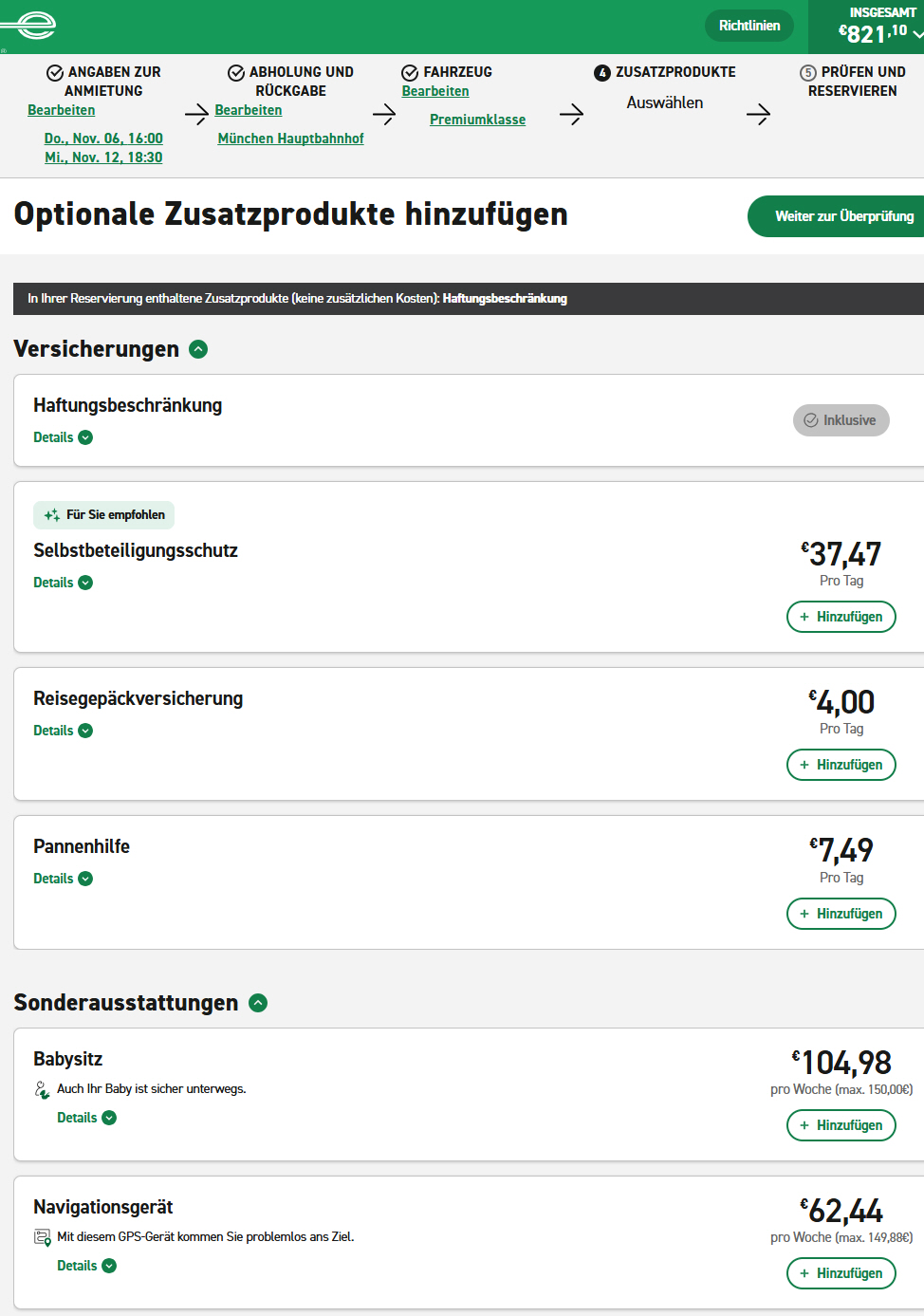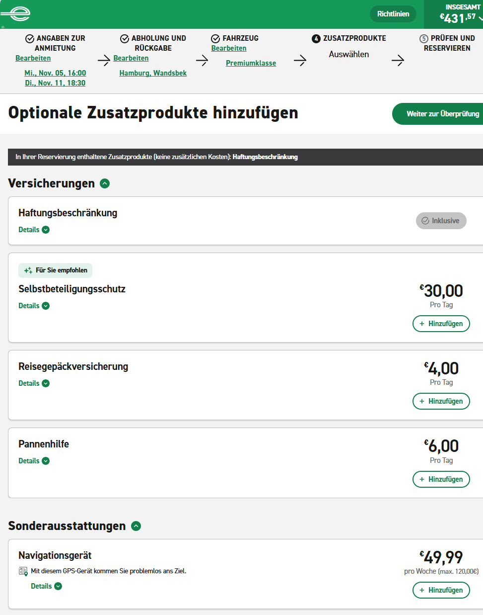 Die Unterschiede bestehen nicht nur zeitlich, sondern auch regional. Das gleiche Fahrzeug (sofern man bei der ergänzenden Formulierung „oder ähnlich“ von einem konkreten Fahrzeug ausgehen kann) kostet für denselben Zeitpunkt und Zeitraum in Hamburg gerade nicht viel mehr als Hälfte des Betrages, den Enterprise dafür in München verlangt.