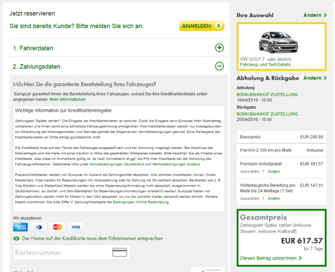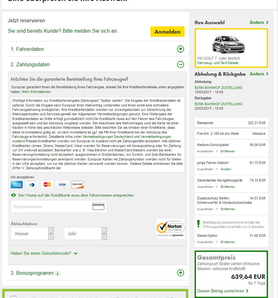 Preisbeispiele Europcar Internet 2017 am 15.03.2017 (für Vergleichbarkeit mit Jungfahrer und Winterreifen, Abbildungen unten)