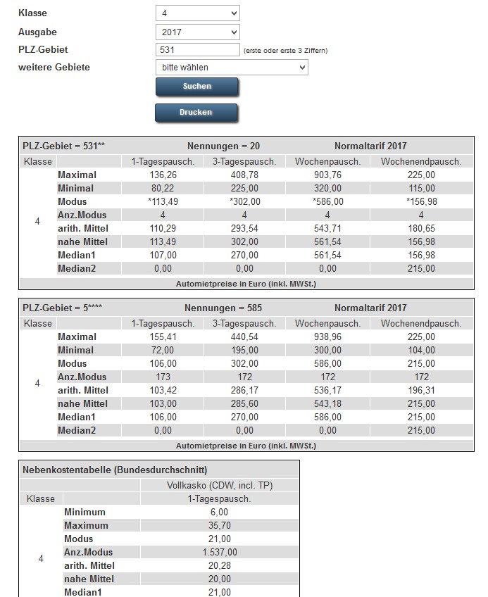 1. Die Werte für einen Normaltarif sind – in Euro – angegeben für ein Fahrzeug der Gruppe 4, Postleitzahl 53* (Fraunhofer), Bonn (Internet-Beispiel Europcar), Bonn (Internet-Beispiel Sixt), 53101 / 15 km-Umkreis (DAT), 531* (Schwacke).