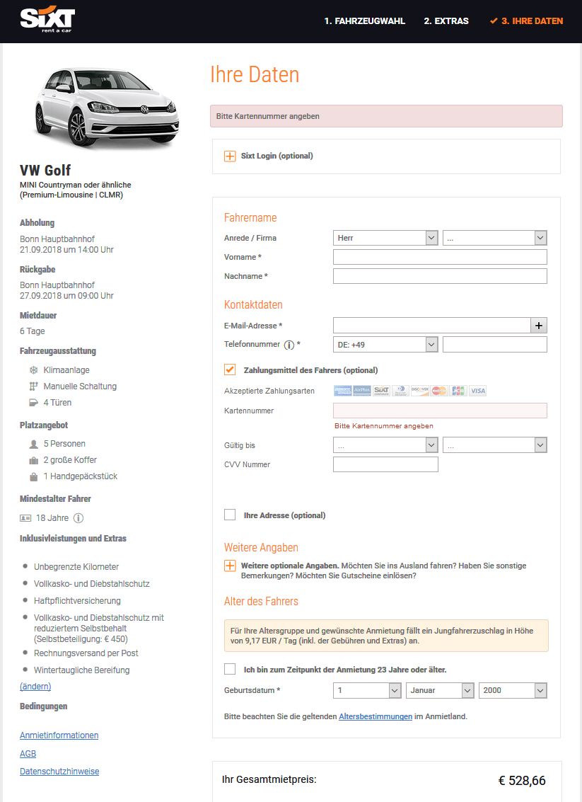 Preisbeispiel Sixt Internet 2018 am 21.09.2018 (für Vergleichbarkeit mit Jungfahrer und Winterreifen, Abbildung unten)