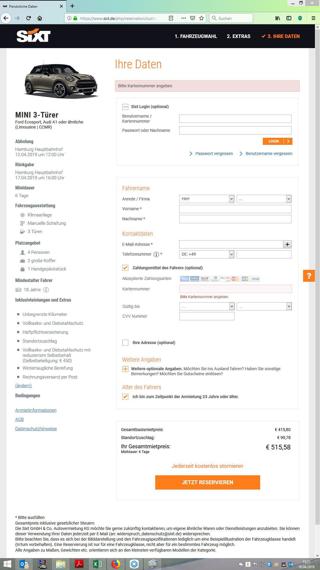 Angebot per Internet am 12.04.2019 in Hamburg, Sixt, Mini 6 Tage ohne Nebenkosten