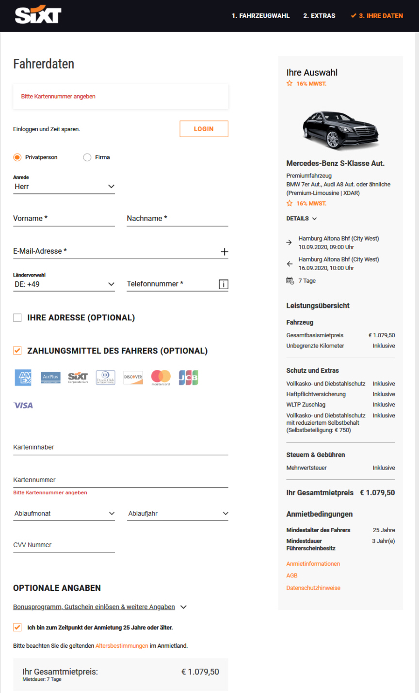 Gruppe 10 am 10.09.2020 für 7 Tage, Grundpreis Mietwagen in Hamburg = 1079,50 Euro, also 154,21 Euro pro Tag.